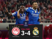 ผลบอล โอลิมเปียกอส 3-4 เรอัล มาดริด : เอ็มบัปเป้ เหมาสี่ตุง! ราชันโดนก่อนไร้ปัญหายิงแซงเฮ UCL