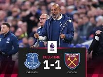พรีเมียร์ลีก อังกฤษ เอฟเวอร์ตัน เปิดบ้านเสมอ เวสต์แฮม 1-1 เมื่อคืนวันจันทร์ ขุนค้อนภายใต้การคุมทีมของ นูโน่ เอสปิริโต้ ประเดิมแบ่งแต้ม ก่อนบุกเยือน อาร์เซน่อล เสาร์นี้
