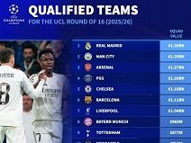 มูลค่าทีม 16 ทีมแชมเปี้ยนส์ลีกตาม Transfermarkt: เรอัล มาดริดนำ, แมนเชสเตอร์ ซิตี้, อาร์เซนอล, ปารีส และเชลซี อยู่ 5 อันดับแรก